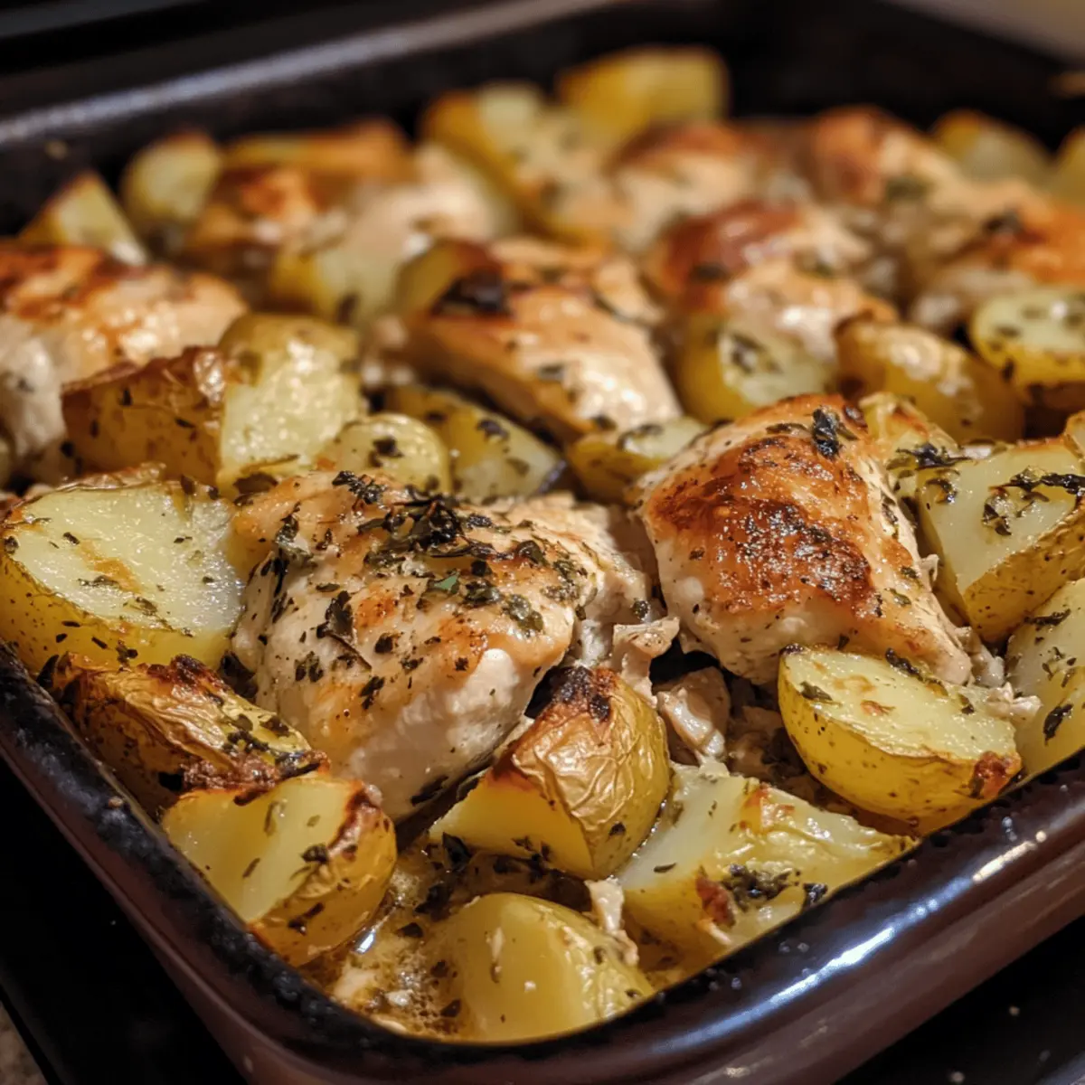 - Roast: Bake uncovered for 35–40 minutes, stirring halfway until potatoes turn golden brown and chicken hits 165°F, yielding juicy meat and crisp, caramelized edges.