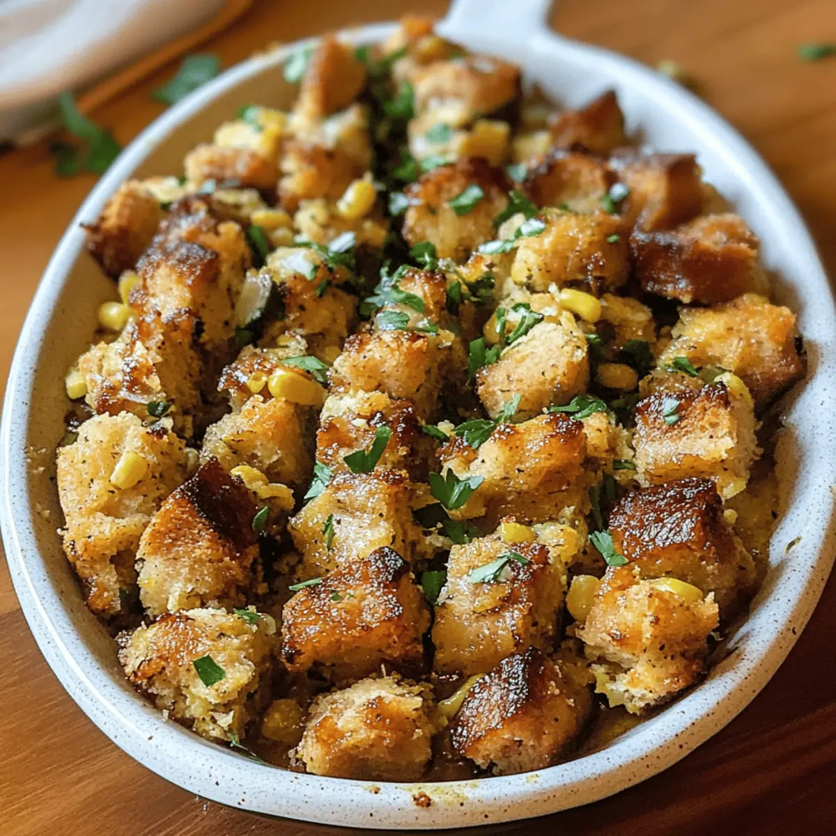 Bake Dressing: Transfer the dressed cornbread mixture into a greased baking dish, smoothing the top lightly. Bake at 350°F (175°C) for 25–30 minutes, or until the edges are crisp and top is golden.