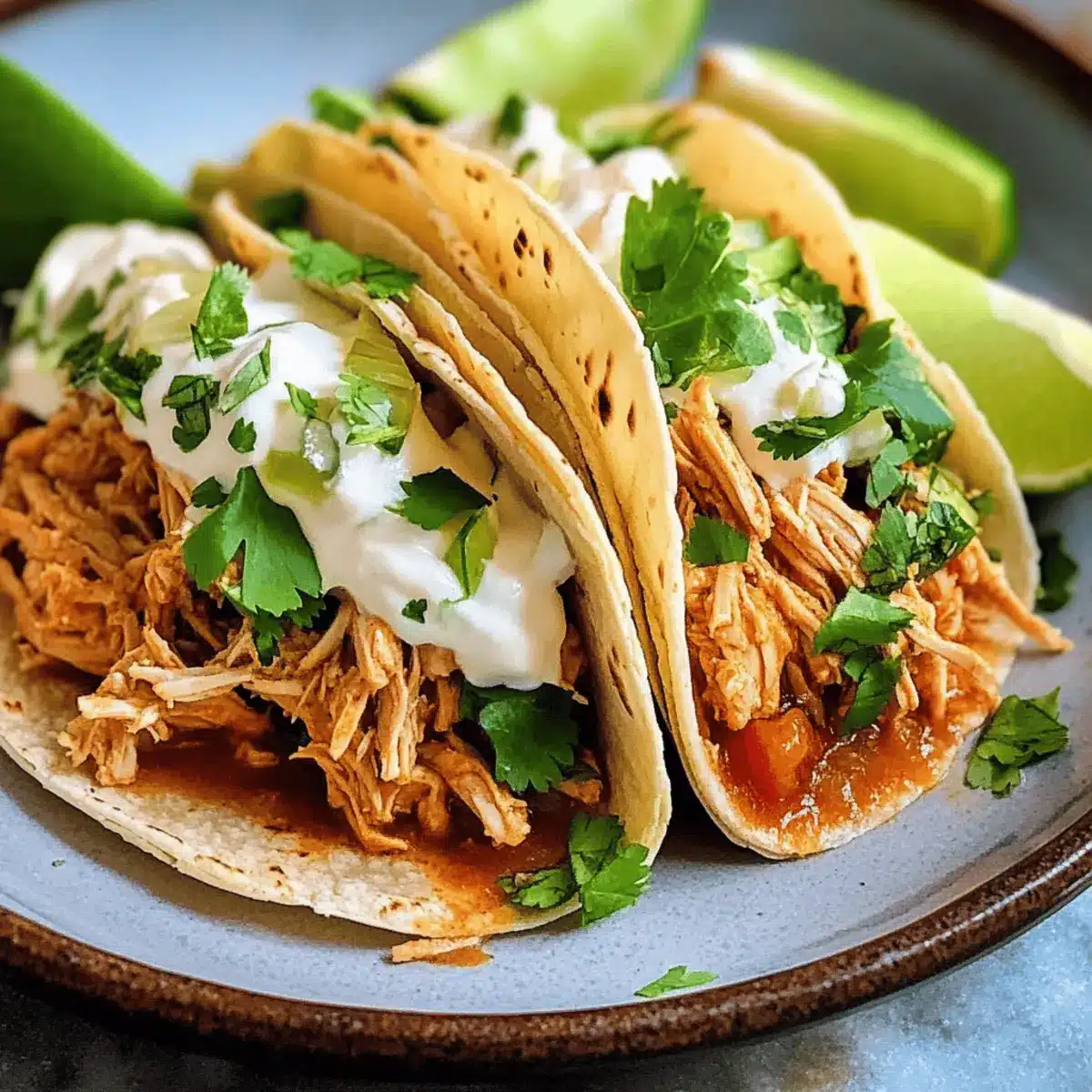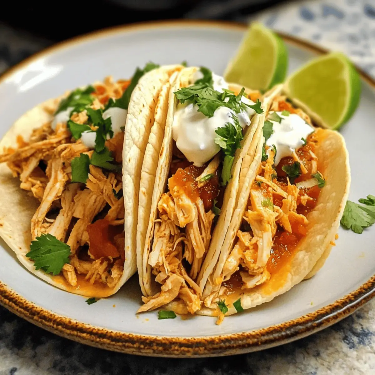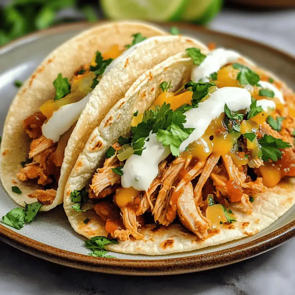 - Assemble tacos: Spoon shredded chicken onto tortillas, then top with cilantro, cheese, a squeeze of lime, and sliced avocado.