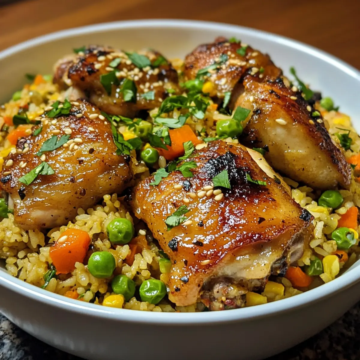 - Nestle & Bake: Arrange chicken thighs back in the skillet, skin-side up, pressing slightly into the rice. Cover with a lid or foil, then bake at 375°F for 20–25 minutes until rice is tender and chicken registers 165°F.