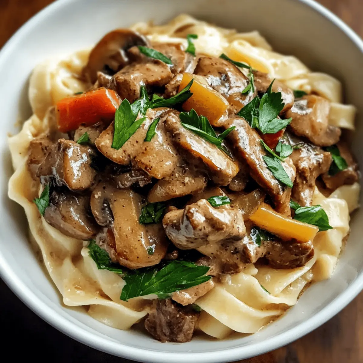 - Garnish and serve: Spoon the stroganoff over egg noodles or mashed potatoes. Sprinkle with chopped parsley and enjoy.