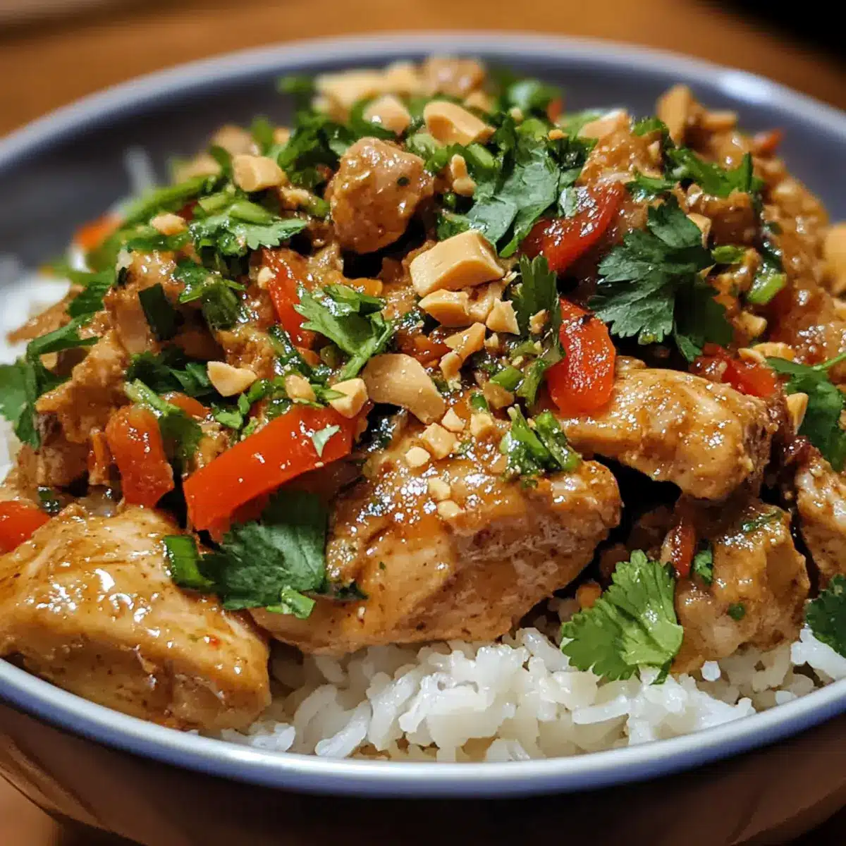 - Serve: Spoon the shredded chicken and sauce over steamed jasmine rice or rice noodles, then garnish with chopped peanuts, fresh cilantro leaves, sliced green onions, and a squeeze of lime.