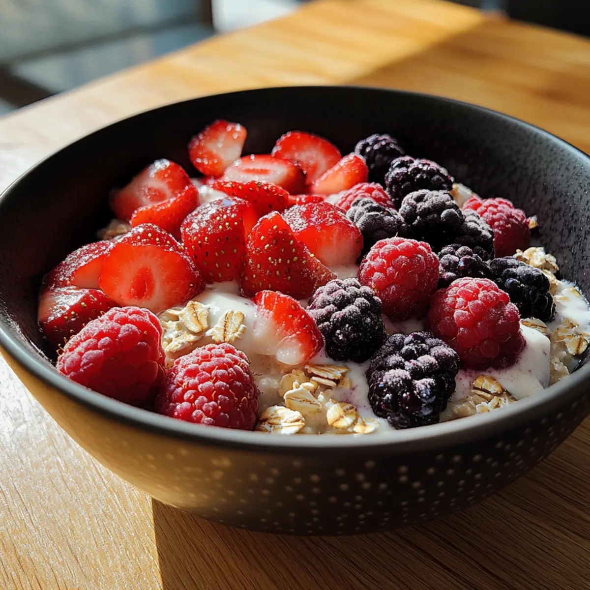 Arrange spoonfuls of fresh or thawed mixed berries over warm oats, letting the vibrant reds and blues peek through for an inviting breakfast bowl.