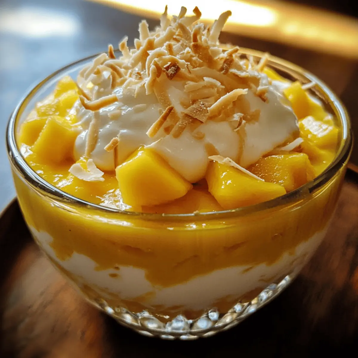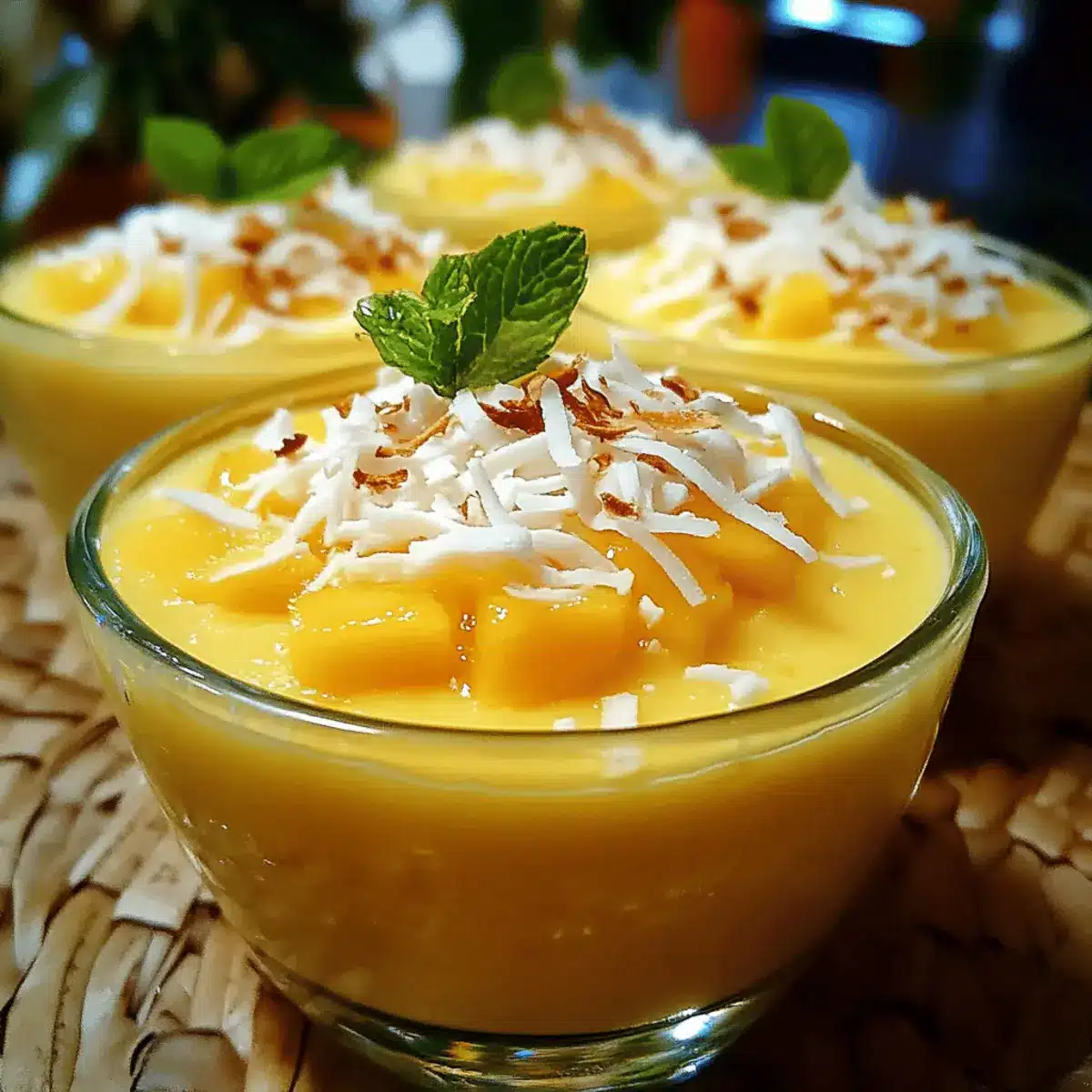 - Garnish & Serve: Just before serving, top each chilled Mango Coconut Pudding with toasted coconut flakes, fresh mango chunks, and a mint sprig for a delightful crunch and aromatic finish.
