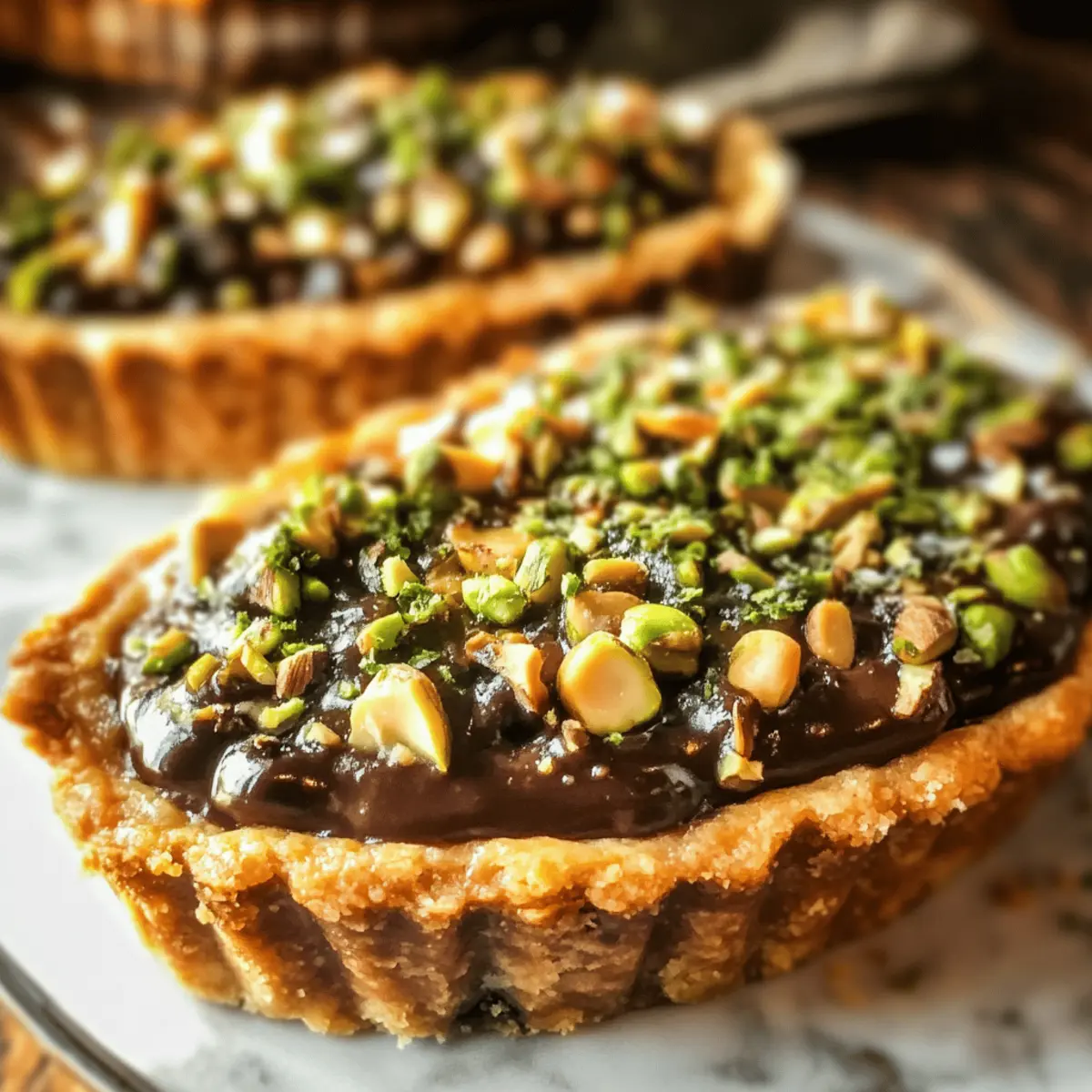 These Chocolate Pistachio Tarts are perfect for meal prep enthusiasts! You can prepare the tart crust up to 24 hours in advance: simply follow the recipe steps to blind bake and then wrap the cooled crust tightly in plastic wrap before refrigerating. The ganache filling can be made up to 3 days ahead; just store it in an airtight container once cooled. To maintain that luscious silky texture, rewarm gently before pouring into the crust. When you’re ready to serve, simply add the pistachio topping and a drizzle of honey or maple syrup. You’ll enjoy a stunning dessert with minimal last-minute effort!