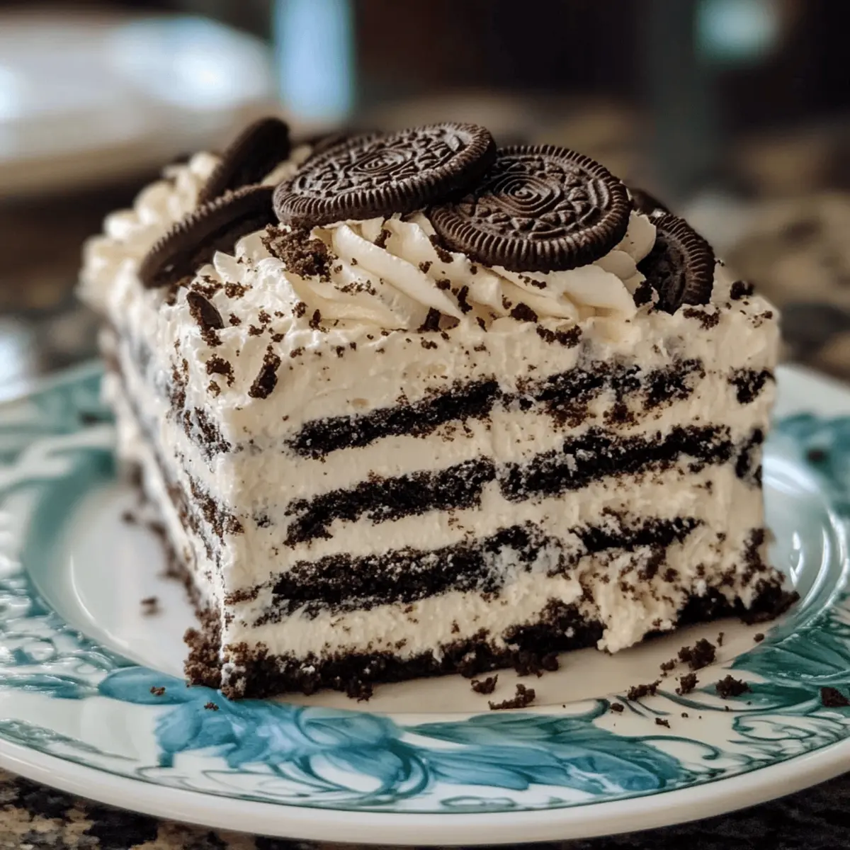 - Repeat Layers: Alternate Oreo cookies and whipped filling, stacking 4–5 layers total, finishing with a final cream layer on top.
