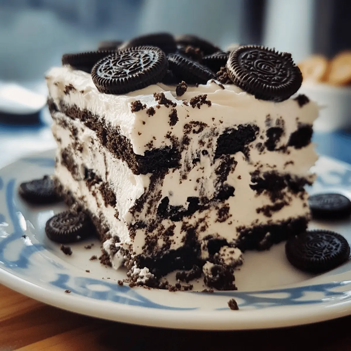 Fridge: Store leftovers in the refrigerator, covered tightly with plastic wrap or in an airtight container, for up to 3 days. This keeps the Oreo layers soft and the whipped filling fresh.